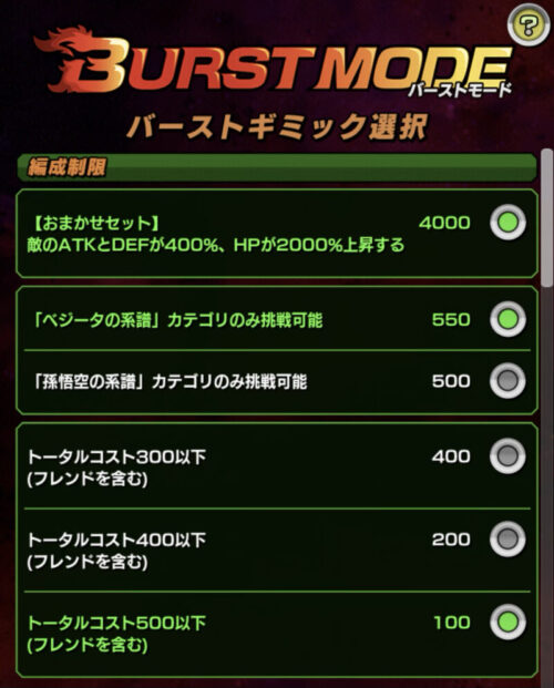 まずはおまかせセットとベジータの系譜、そしてコストは500以下を選択し…