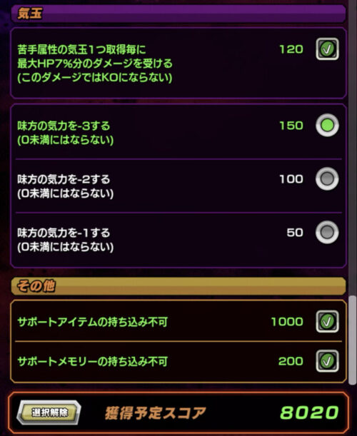気玉やサポートアイテム、メモリーは持ち込み不可にしてこれで8020とスコアは取れます!