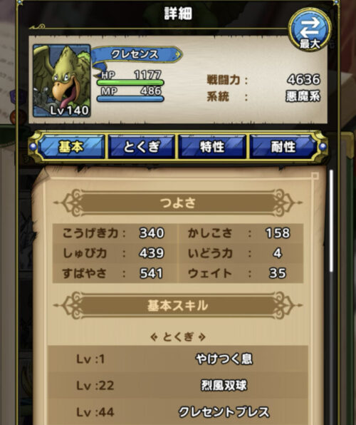 クレセンスはすばやさが541となかなか高く、更に移動力も4と高いんですよね!