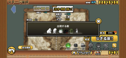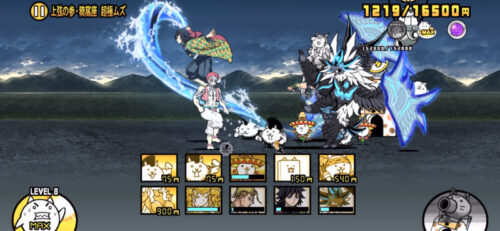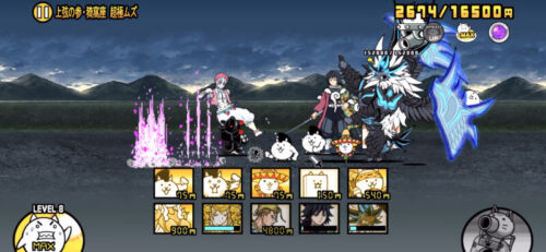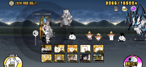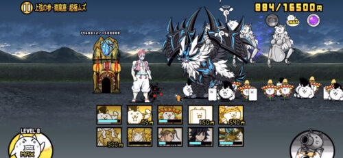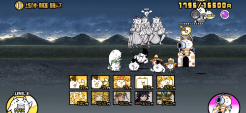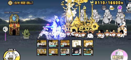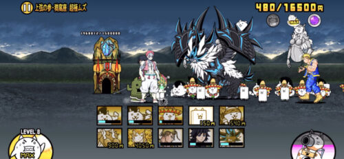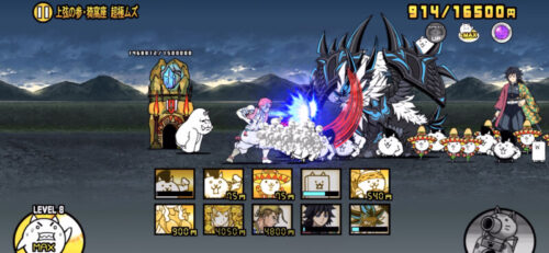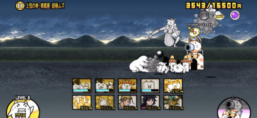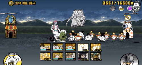 まずゴリラの敵が出てくるので、半分くらい敵が迫ってきたところで壁役のネコモヒカン、大狂乱のネコモヒカン、ネコアミーゴなどを出現しつつネコパーフェクトを出しましょう!
