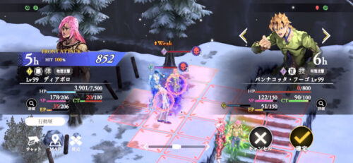 そして最後はブチャラティとフーゴが出てきますので、まずここから先は場所を動かずに「逃がさんッ!」で物理防御貫通を付与しまして…