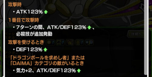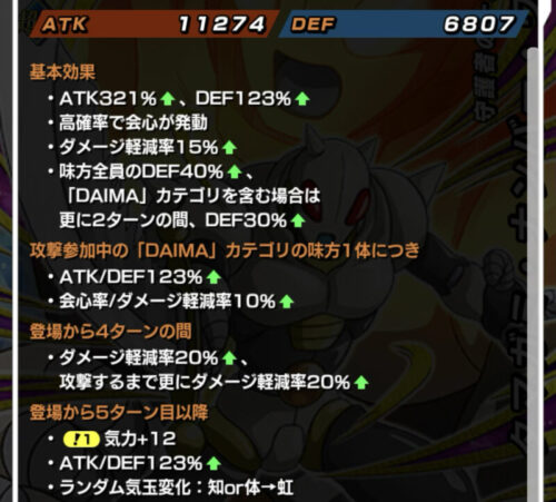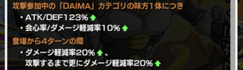 味方全体のDEFを40%まで上げ、更にDAIMAカテゴリなら2ターンの間だけですが更に30%上げてくれるのは強いですね!!