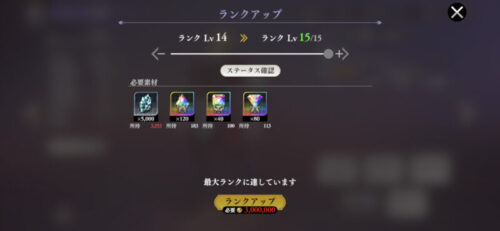 このランクアップの素材ですが、かなり周回しないと必要数は集まりませんね…
