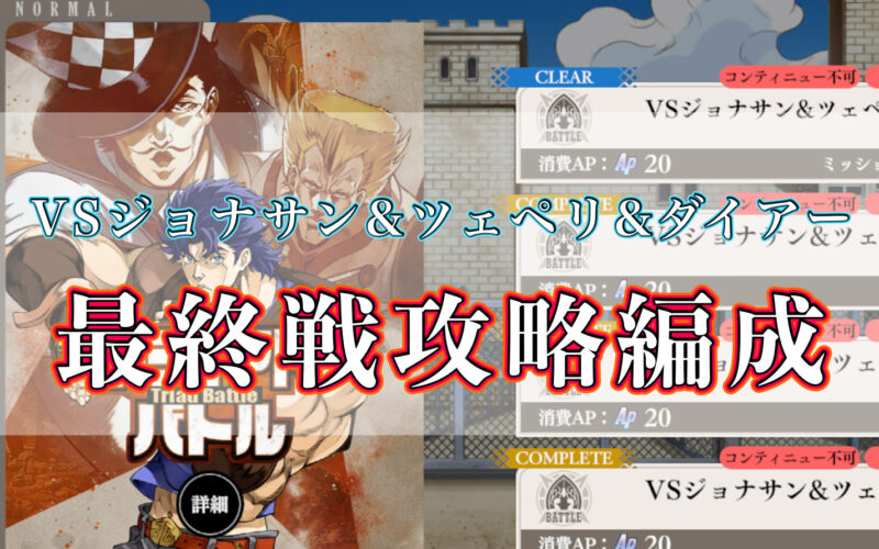 今回はトライアドバトルVSジョナサン&ツェペリ&ダイアー最終戦の攻略編成をご紹介します!