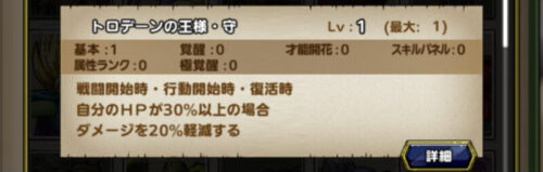 まずトロデですが元々自前で「トロデーンの王様・守」でHP30%以上の時にダメージ20%軽減してくれますが…