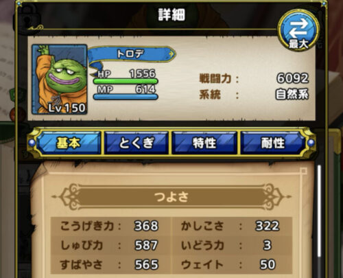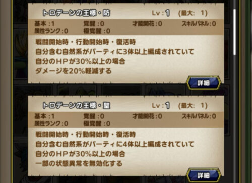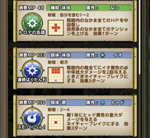 トロデの特技は全体に自然系の仲間のテンションを上げたり、ネイチャーブレイクで自然系からの被ダメージ増加させたりと自然パーティのサポーターですね!