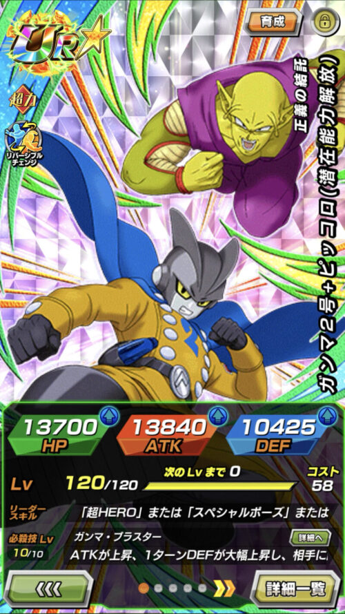 ※今回は極限Z覚醒の冷静沈着なヒーロー:ガンマ1号のみの使用感を書きたいので、極限Z覚醒後の大胆不敵なヒーローガンマ2号は連れてきておりません。