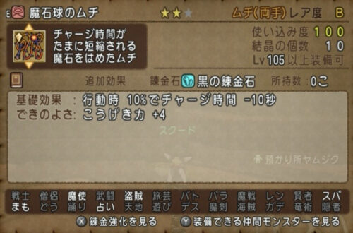 装備は自分は魔石球のムチは装備し、チャージ時間を減少させてエモノ呼びの咆哮を早めましょう。